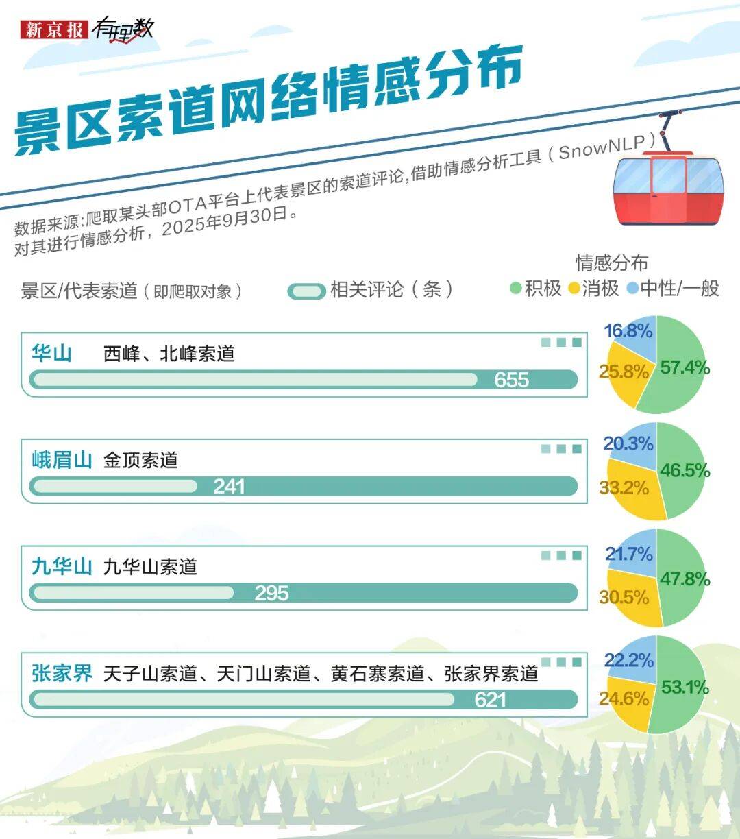 但同时,各景区索道也有不少负面评价,峨眉山、九华山的负面评价占比均超过30%,核心争议点集中在“价格贵”和“运营管理跟不上”。